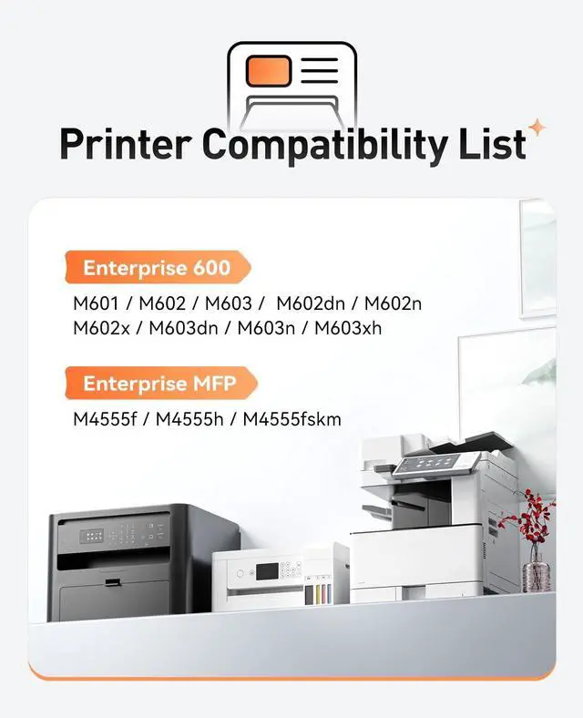 ^^ Compatible Printer: Compatible with HP LaserJet Enterprise 600 M601 M602 M603 Printer M602dn, M602n, M602x, M603dn, M603n, M603xh; HP LaserJet Enterprise M4555f MFP, M4555fskm MFP, M4555h MFP, M4555 MFP Series Printer.