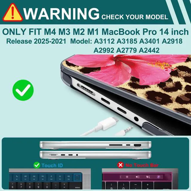 Compatible With - Only for MacBook Pro 14 Inch 2025 2024 2023 2022 2021 (Only compatible model: A3434/A3112/A3401/A3185/A2918/A2992/A2779/A2442). Please confirm the model on the bottom of the MacBook before ordering ^^ Durable Material -case for MacBook Pro 14" M5 M4/M3/M2/M1 is made of hard PC material, effective anti-slip/shockproof/anti-scratch etc ^^ Case Design - The case adopts the top and bottom case separation design, easy to install and remove ^^ Case Port Design - Precise cutouts allow full access to all ports, features, buttons, and Touch ID functionality ^^ Package - Included 1 case for MacBook Pro 14 inch, 1 Keyboard Cover, 1 Trackpad Protector, 2 OTG Adapter