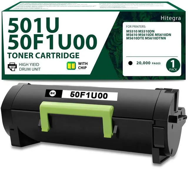 Remanufactured 50F1U00 Toner Cartridge - 50F1U00 toner cartridge with 1 pack (Black/50F1U00), upgraded materials and chip bring the perfect printing experience ^^ High Capacity Yield Pages - MS510 toner cartridge up to 20, 000 pages for black, based on 5% coverage of A4/Letter ^^ Compatible with Printers - 50F1U00 toner cartridge replacement for Lexmark MS510 MS510dn MS610 MS610de MS610dn MS610dte MS610dtn printers ^^ 50F1U00 Black Toner for Hitegra - MS510dn toner can automatically recognize the printer, and press determine key according to the reminder after connecting the printer. Compatible cartridge can provide printing for clear and natural print result ^^ Be Widely Used - Hitegra MS610 black toner cartridge is widely used in a variety of occasions, including banks, hospitals, schools, companies, shops and so on, whether it is home printing or office printing can be used ^^ Satisfactory Experience - 501U toner cartridge offers reliable compatibility and produce clear text and vivid image effect.