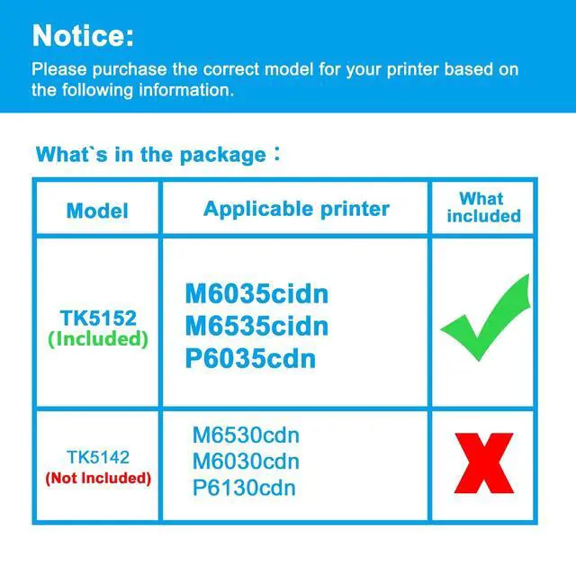 Reliable Quality: LCL TK5152 cartridge uses high quality toner, toner particle size distribution, good mobility, high transfer rate, resulting in a clear image and high gloss print effect; Printing efficiency is high, waste powder rate is low, so as to ensure sufficient page yield.