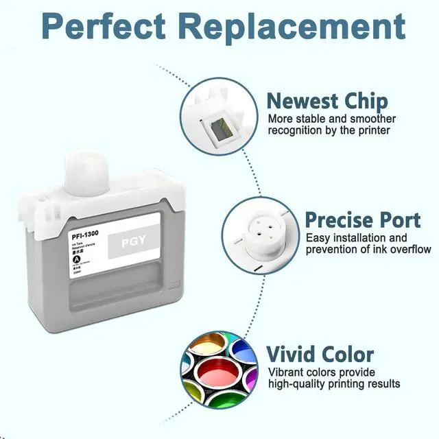 Superior Quality: This high-yield PFI-1300 ink cartridge uses the latest chip technology and high-quality pigment ink, with an anti clogging nozzle design and easy installation. Provide clear text and graphics ^^