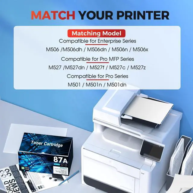Compatible Printers: 87A toner cartridge for hp printer works for HP Laserjet Enterprise Flow MFP M527c, M527z; Enterprise M506dh, M506dn, M506n, M506x; Enterprise MFP M527dn, M527f; Pro M501dn ^^ Up to 9, 000 pages per replacement for hp 87a black toner cartridge at 5% coverage, A4 paper ^^ This 87a toner cartridge for hp printer is strictly tested for smooth printing experience with dark and clean printing results. Effectively prevent clogging, leakage, and smudges