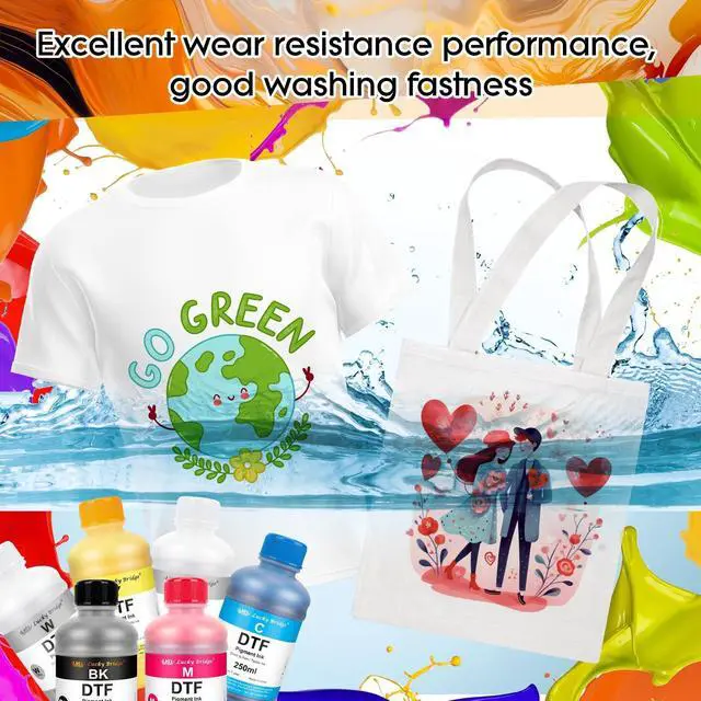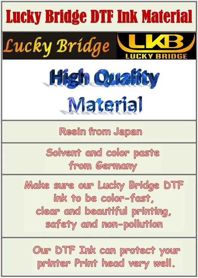 DTF ink instructionCompatible: L1800, L800, L805 1430, P400, P408, P600, P608, P700, P800, P900, P5000, P6000, R1390, R1800, R1900, R2000, R2400, R2880, R3000, R3880, 4720, 4800, 4880, 4900, 5113, 7880, 7890, XP600, XP 15000, ET8500, ET8550 I3200 DX7, DX5, TX800 printer etc. Work with Lucky Bridge DTF film and powder.