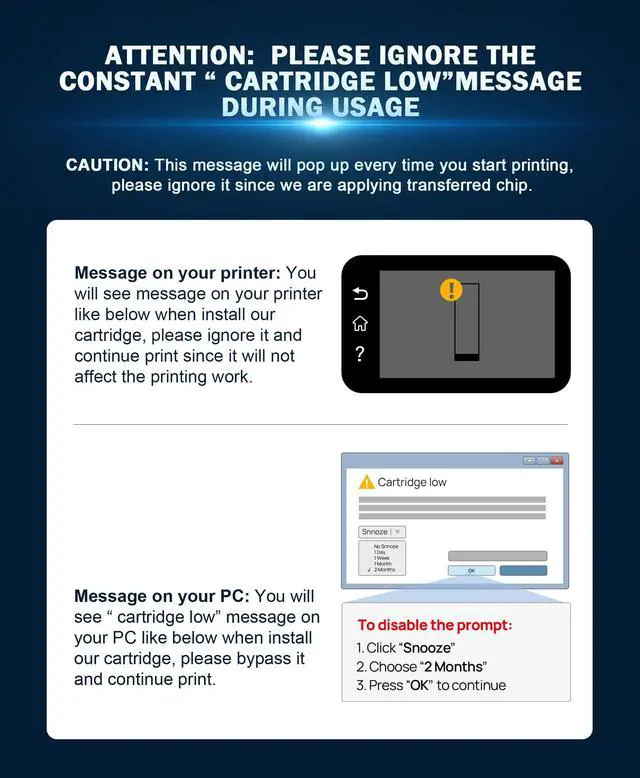 ^^ Low Ink Tips: The printer working with our 134A toner could not show the remaining toner level, but which would the printing and page yield. You can see message on your PC like below when install our cartridge, please bypass it and coutinue print.