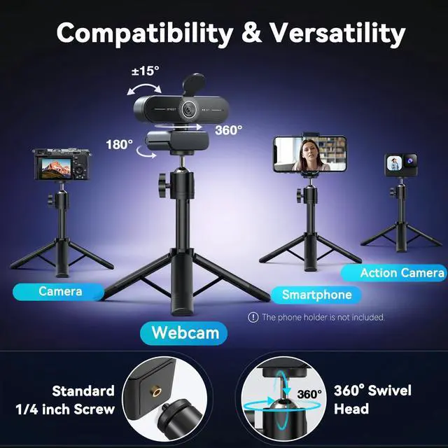 Adjustable Heights with 360 Swivel Head - The C60E 4K webcam with tripod adjusts from 6.7 to 18.5 inches, meeting all your needs. Use 6.7 inches for clear face visibility, mid-level heights for group presentations, or 18.5 inches for full-body shots. The 360 swivel head ensures smooth angle adjustments for ideal framing in portrait or landscape mode. Compact and versatile, its ideal for live streaming, video calls, and creative projects, delivering flexibility and convenience in every setting. ^^ High Compatibility Tripod - The tripod of this 4K webcam for PC comes with a universal joint, supporting 360 rotation and flexible viewing angle, making it very suitable for live streaming scenes with multiple movements.