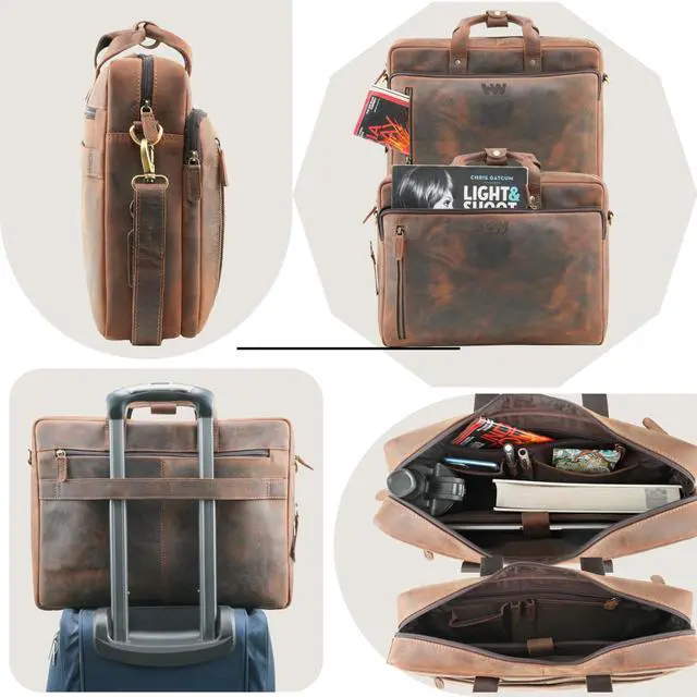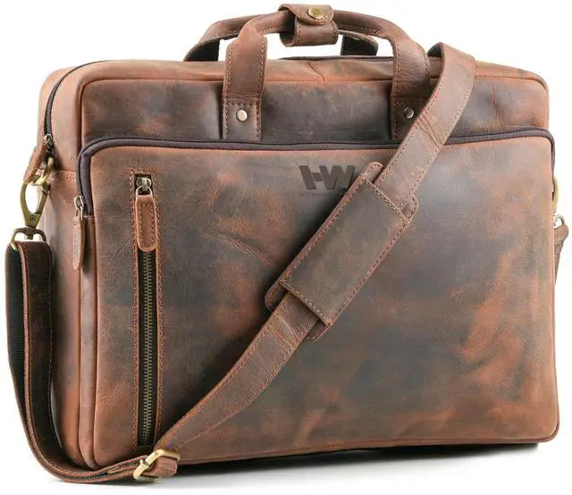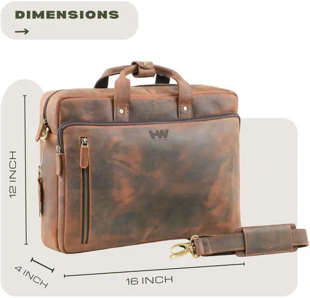 Full-Grain Buffalo Leather That Ages Beautifully Crafted from 100% full-grain hunter buffalo leather, this messenger bag develops a rich patina over time. Finished with durable YKK zippers, solid brass fittings, and premium polycotton lining for long-lasting quality. ^^ Fits Laptops Up to 17 with Secure Protection Dedicated padded laptop compartment comfortably fits most 17-inch laptops, including MacBook Pro, Dell, HP, and more making it ideal as a professional leather laptop bag for office, meetings, and travel. ^^ Smart Organization for Work & Daily Essentials Designed for efficiency with 1 front vertical zipper pocket, 1 front zip pocket, 1 back zip pocket, 1 inner zipper pocket, pen holders, and 2 slip-in pockets keeping chargers, documents, phone, and accessories organized without clutter.