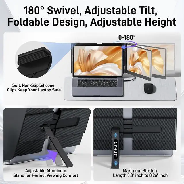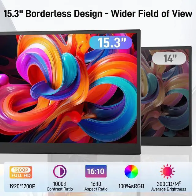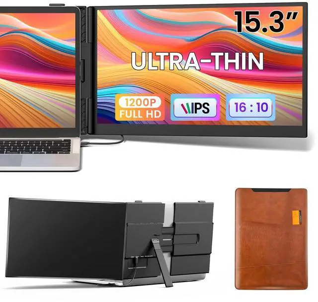 This optimized metal-and-plastic design reduces overall weight and ensures a stable, ergonomic setupperfect for commuting or remote work. ^^ 15.3" FHD 16:10 IMMERSIVE DISPLAYExperience stunning clarity and vibrant colors with this portable laptop monitor, featuring a 15.3 1200P FHD IPS display that covers 100% sRGB color gamut for true-to-life visuals. The 16:10 aspect ratio provides extra vertical workspace, while the ultra-thin bezel design maximizes your screen for seamless multitasking, gaming, and creative work. ^^ PLUG & PLAY DUAL MONITOR SETUPNo software needed. This laptop monitor extender offers true plug-and-play convenience.
