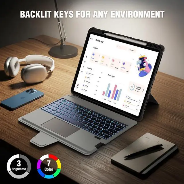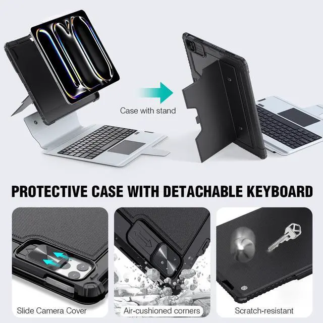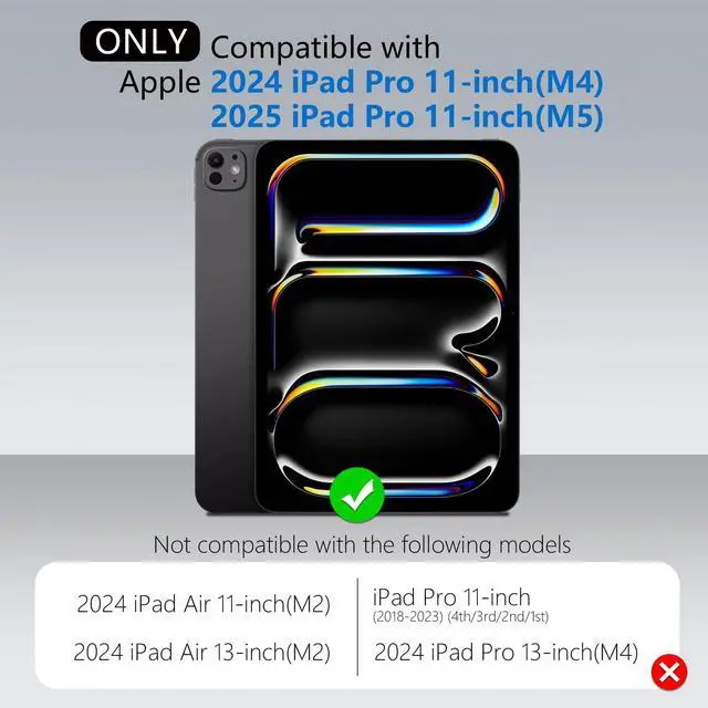 Model: A3357, A3358, A3359 ^^ Product OverviewThis iPad Pro 11 case features a versatile two-piece design, allowing the keyboard to be detached for standalone use of the protective case with its integrated standideal for travel, business, and academic environments. The adjustable stand provides a stable viewing experience with a 180 range, suitable for typing, writing, and drawing. Additionally, the case includes a dedicated Apple Pencil holder with magnetic attachment and wireless charging capability (Apple Pencil not included) ^^ Bluetooth and Backlit KeyboardThis ipad keyboard case is available in 7 backlit colours with 3 levels adjustable brightness, the different color backlit keyboard is great for when you want low lighting to study or write. A full row of function keys is customized for your tablet, support for iPadOS shortcuts for quick editing of documents and presentations, maximizing your productivity ^^ Multi-Touch TrackpadThis ipad pro m5 11 inch case with a built-in precision trackpad that can quickly and easily navigate your iPad. Full multi-touch gesture support (like tap, swipe, scroll and switch apps), lets you redefine productivity by allowing you to edit documents, build presentations, and browse the web with unparalleled speed.