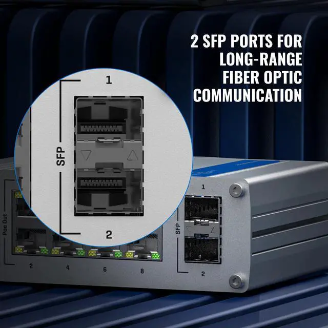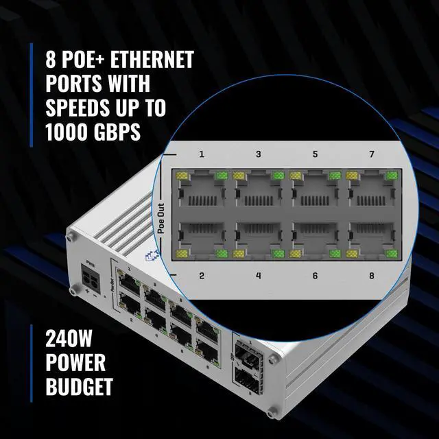 POE+ POWER EFFICIENCY: This 8 port PoE Switch supports IEEE 802.3 af/at standards, providing up to 30W per port, centralizing power and data for seamless device operation. Ideal for powering IP cameras, access points, and other PoE-enabled devices, this Gigabit PoE Switch simplifies installation by minimizing the need for additional power cables. ^^ DUAL SFP PORTS FOR FIBER CONNECTIVITY: With 2 SFP ports, this Gigabit Ethernet Switch is engineered for long-range fiber-optic communication, enabling secure and high-speed data transfer over vast distances. Perfect for large infrastructures, this internet Switch ensures smooth and efficient network Switch expansion without compromising on speed or performance. ^^ UNMANAGED, PLUG-AND-PLAY