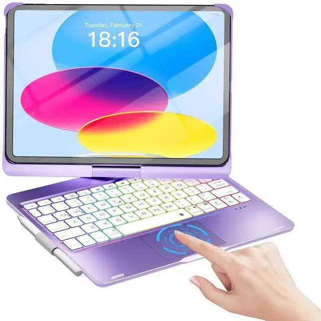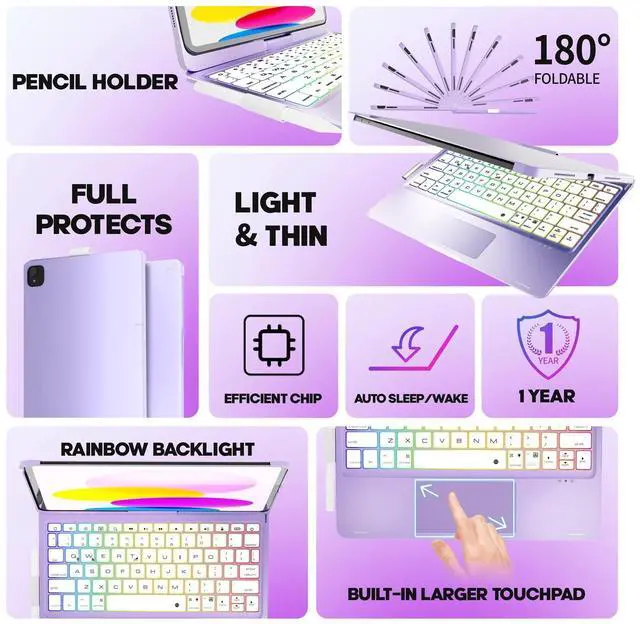It allows you to control the iPad in a whole new way. You can easily edit documents, surf the web, and complete various tasks efficiently, significantly boosting your productivity when using the iPad and bringing you a convenient operating experience. ^^ 7-Color BacklitThis keyboard for ipad 10th generation features a rainbow backlit. iPad 10th generation case with keyboard has 3 adjustable brightness levels, allowing you to customize the backlight brightness according to your personal preferences and ambient lighting conditions. Whether you're using it in a dimly lit room or a brightly lit space, this feature will provide you with a more enjoyable typing experience when using the 10th gen ipad case with keyboard.