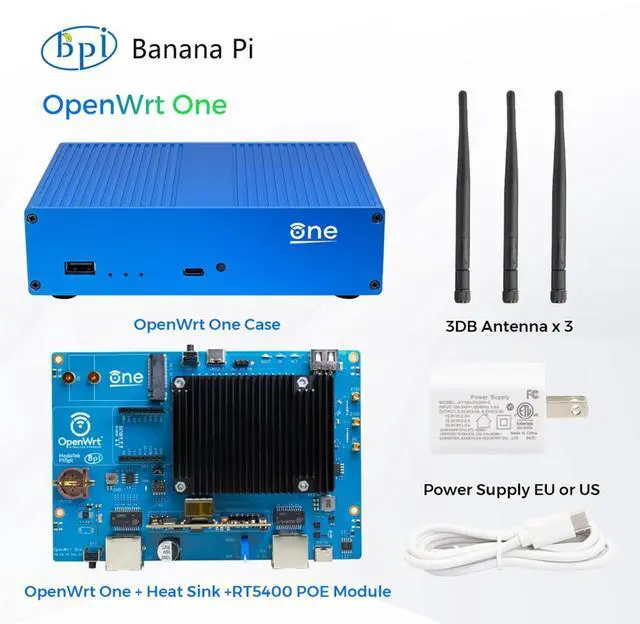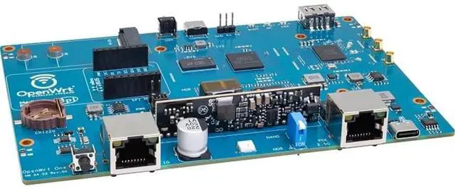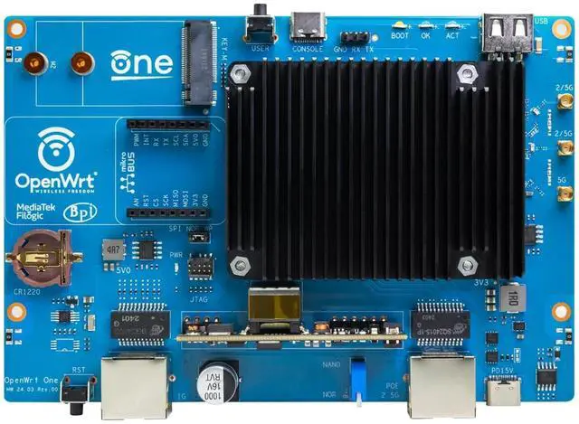 OpenWrt One/AP-24. XY router board is based on the MediaTek MT7981B (Filogic 820) SoC and MediaTek MT7976C dual-band WiFi 6 chipset. It is the first official development board from the OpenWrt open-source community, co-designed with Banana Pi. ^^ OpenWrt One utilizes MediaTek's MT7981B SoC, featuring dual ARM Cortex-A53 cores clocked at 1.3 GHz. It comes equipped with 1 GB DDR4 RAM and 256 MB SPI NAND storage, integrating an additional 16 MB protected storage for system backup. Dual storage hardware safeguards the onboard system. ^^ OpenWrt One integrates an M.