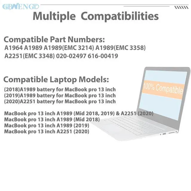 Battery Condition: 100% brand New from Manufacturer. ^^ Compatible Model (2018) A1989 battery for MacBook pro 13 inch (2019) A1989 battery for MacBook pro 13 inch (2020) A2251 battery for MacBook pro 13 inch ^^ Compatible Part No#A1964 A1989 A1989 (EMC 3214) A1989 (EMC 3358) A2251 (EMC 3348) 020-02497 616-00419 ^^ Quality First We have passed a series tests of short circuit, overheating, and overload protection before shipments. The newest generation chips, grade A cell battery, provide long cycle life, stable performance and broad compatibility. ^^ Service First-rate We promise 30-Day Refund & 1-Year Warranty. For any battery questions, just feel free to contact us for help via the order or click on"GBNENGTD", then you can see "Ask a question" on the page. We are here to serve for you for any battery problems within 24 hours.