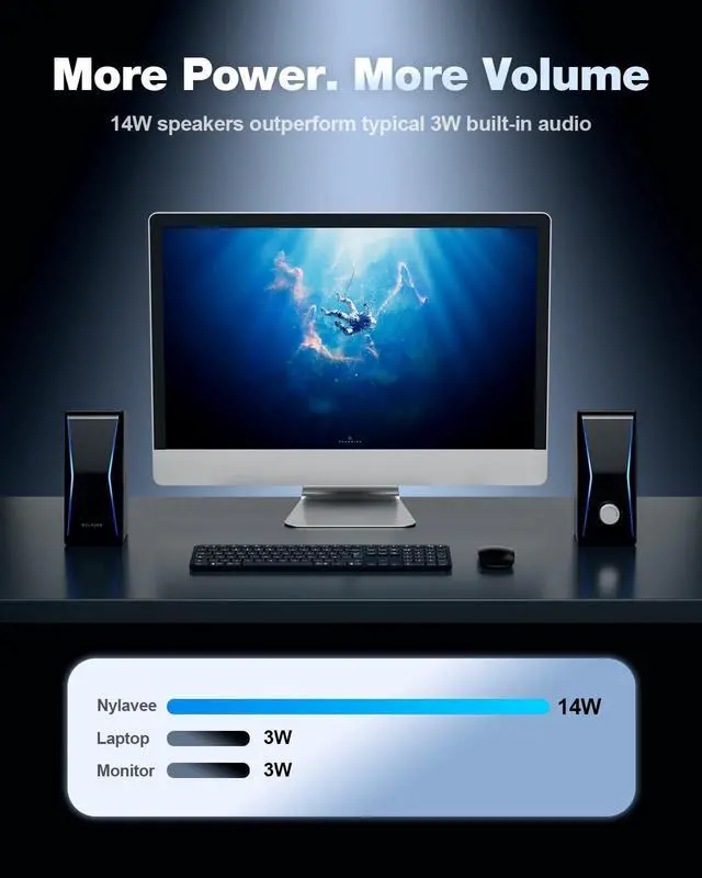 Top-notch Stereo SoundDesigned with four speaker units and two passive radiators, these computer speakers produce cleaner highs and fuller mids, creating balanced stereo sound for music, videos, and gaming at your desk ^^ 14W RMS Desktop VolumePowered by a 14W RMS (28W peak power) AC adapter, these pc speakers deliver louder, clearer sound than typical USB-powered options, outperforming built-in laptop and monitor speakers for everyday desktop listening ^^ Bluetooth & AUX ReadySupport Bluetooth 5.0 and 3.5 mm AUX input for flexible use with desktop PCs, laptops, monitors, PS5 and smart phones.