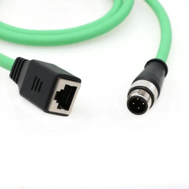• The 4 Pin Male , RJ45 Female Connector ethernet cable is a single foil twisted pair cat5e cable with a black PUR jacket rated at 24 AWG shielded wire. Both the M12 and RJ45 connectors have a molded black TPU strain Relief.