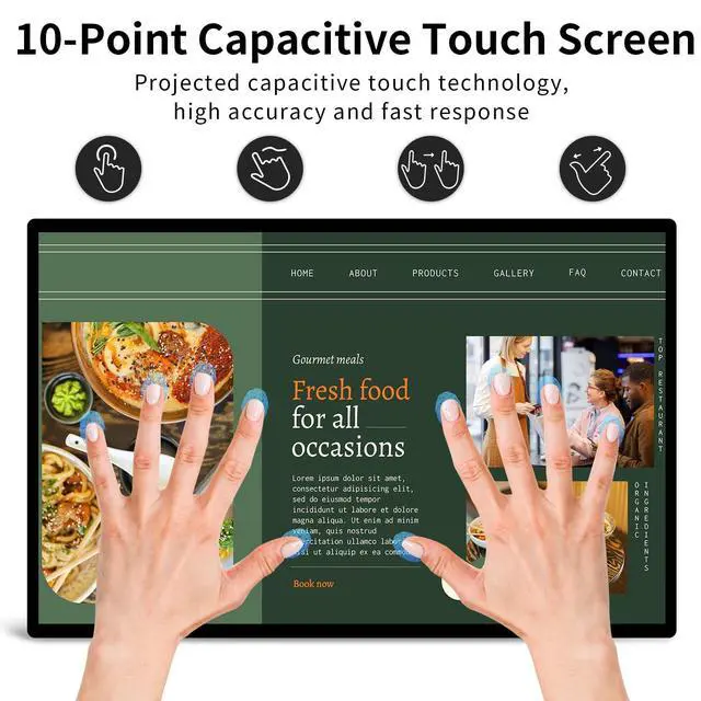 Ports: 1 x RJ45 100/1000M, 1 x HDMI-IN, 2 X USB-A, 1 x MicroSD cart slot, 1 x DC. All in One touch screen monitor with built in Automatic playback and timing app and support wireless screen mirroring ^^ Interactive Digital Display Built in 10000 mAh battery supports up to 4~6 hours of use, 10 Points Multi-touch screen capacitive touch screen can achieve a more effective human-tablet pc interactive function ^^ Multi Senario ApplicationCommercial advertising display perfect for public spaces, museums, sporting arenas, shopping malls, supermarkets, bars, jewelry counters, companies, exhibitions, cinemas, hotels churches, academic buildings, retail stores, corporate spaces and restaurants to offer wayfinding, messaging, marketing and outdoor advertising ^^ Professional Factory As a professional manufacturer with over 20 years of experience, specializing in OEM/ODM of big brands, we are committed to providing high-quality interactive touchscreen, panel, digital display, available 24/7 to assist you with any queries or concerns We provide a one-year warranty to give you worry-free after-sales service