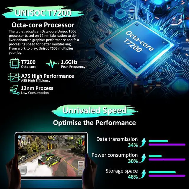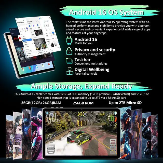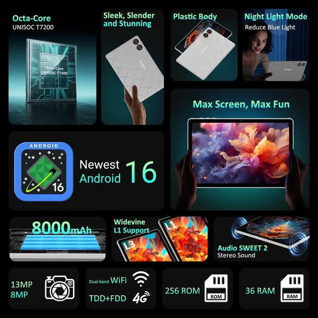 POWERFUL PERFORMANCE: Equipped with 36GB RAM and 256GB ROM (expandable up to 2TB), powered by T7200 Octa-Core processor for smooth multitasking ^^