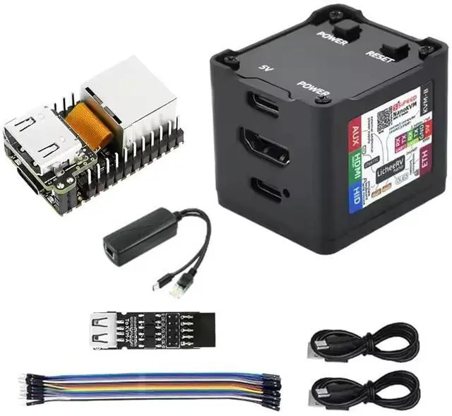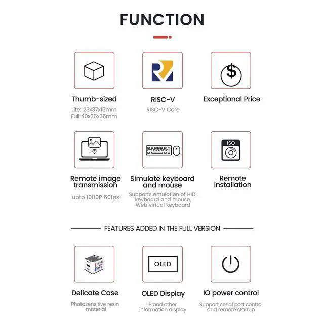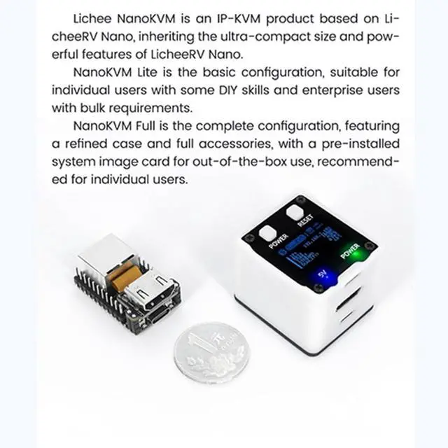It also utilizes spare TF card storage space, mounting it as a USB flash drive device. ^^ 100Mbps Ethernet SupportSipeed NanoKVM features a 100Mbps Ethernet port for network transmission of video and control signals. The Full version additionally includes an ATX power control interface (USB-C) for remote host power status monitoring and control. The Full version housing also incorporates an OLED display showing the device's IP address and KVM-related status. ^^ Server ManagementSipeed NanoKVM enables real-time monitoring and control of server operations. Supports remote desktop access and host power cycling: NanoKVM overcomes limitations requiring the host to be networked or specific system software, functioning as external hardware to provide direct remote control capabilities. ^^ Supports Remote InstallationSipeed NanoKVM emulates a USB flash drive device, enabling mounting of installation images for system deployment or access to computer BIOS settings. The NanoKVM Lite features two serial ports for use with IPMI or connection to other development boards via web-based serial terminal interaction. Users may also expand functionality with additional accessories.
