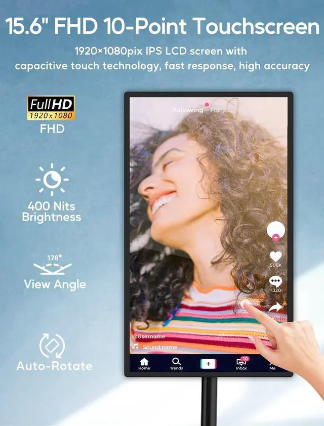 Touch Screen: The 15.6" LCD monitor features a 2K FHD touch panel for a high-definition visual and interactive experience. It is designed with a 0.4" ultra-narrow bezel and a 0.3" ultra-thin body, weighing only 2.3 lbs. Included all-metal floor stand can be adjusted to different angles by lifting, rotating and tilting as needed. Built-in 10000mAh battery, fully charged can be used continuously for 4-6h ^^ Android 11.0