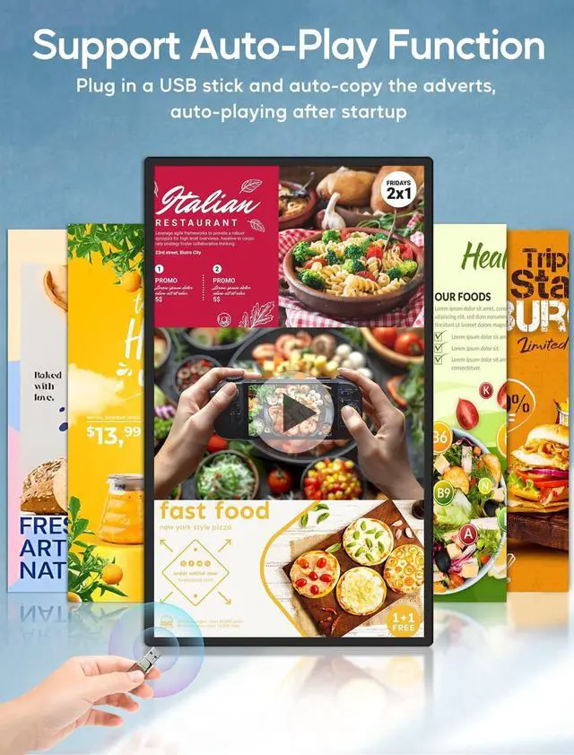 Industrial Grade Digital Signage Display: The indoor digital signage features a 500 cd/ high brightness IPS panel and a lightweight aluminum frame, designed for daily high-traffic work environments. It supports both horizontal and vertical wall mounting with 75x75 mm VESA holes and includes a desktop stand, also haves 1x RJ45 100/1000M port, 1x MicroSD card slot, 1x HDMI output port, 1x USB 2.0 input port, 1x USB 3.0 input port, built-in 2x 2W speakers, and a 3.5 mm audio jack ^^ Open App Ecosystem and