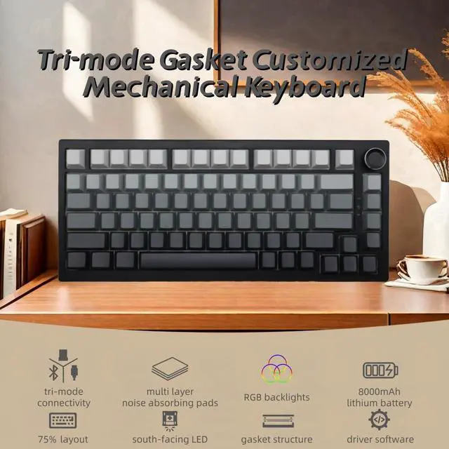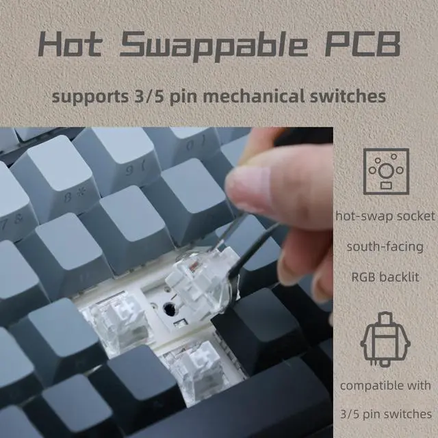 HOTSWAP GASKET KEYBOARD This 75% layout mechanical keyboard is equipped with a hotswap socket and a gasket structure plate,supporting most of 3pin/5pin switches on the market,so that you can replace the switches as you like.