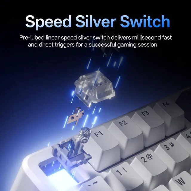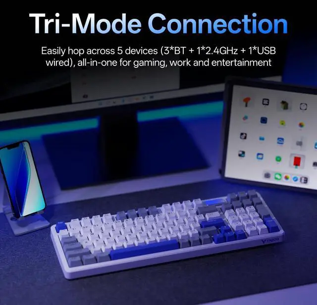 Tri-Mode ConnectionConnect using Bluetooth 5.0 (up to 3 devices), 2.4GH z or USB wired option, provides seamless switching between pc, laptop or mobile devices for gaming, work and entertainment. ^^ Hot-Swappable Speed Silver SwitchFeaturing pre-lubed linear speed silver switch with low spring resistance, the V700DIY delivers millisecond fast and direct triggers for a successful gaming session. ^^ 16.8M Per-Key RGBProvides enhanced customization with individual key backlighting control, creating unique color schemes and lighting effects synchronized with your personalized setups and in-game events. ^^ Gasket Structure with Creamy SoundUnique, integrated dampening foam with 7-layer switch-dampening pad structure absorbs pinging noises and echoes for improved keystroke acoustics.