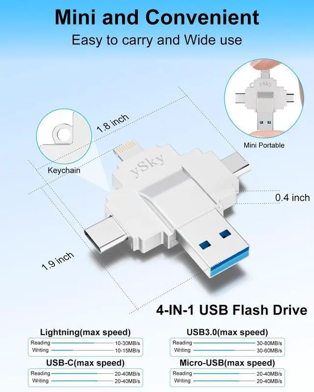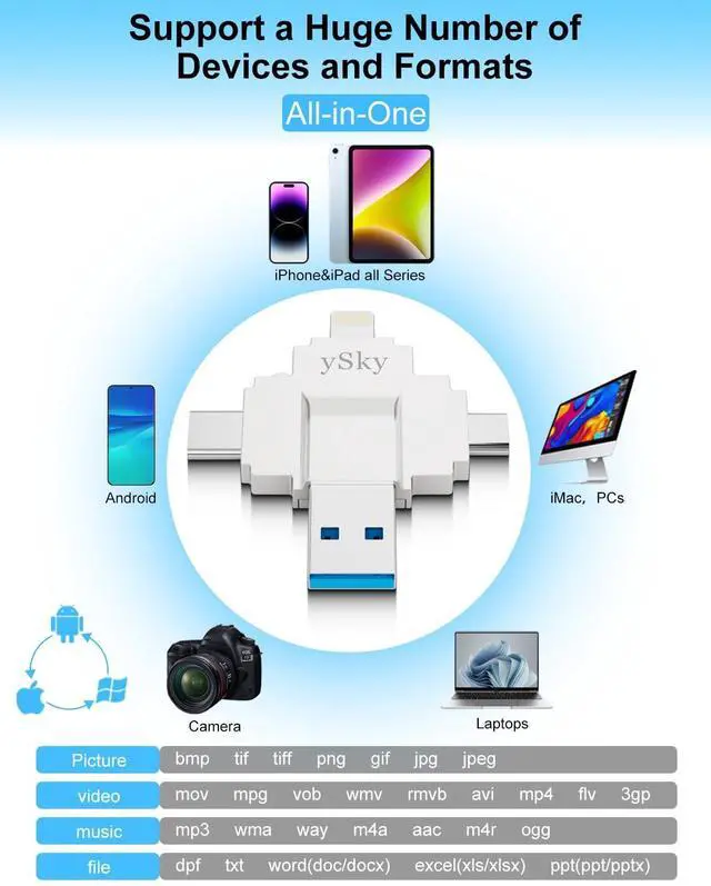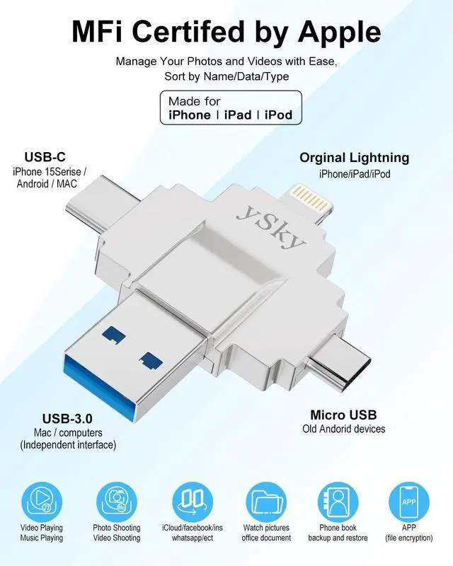 This Photostick provides a convenient way to work seamlessly with various devices. Only one ySky 4in1 flash drive can work for your whole family. MFi certified Photo stick for iPhone is Compatible with iPhone 15/14/13/12/11/8/7/6 Series, SE/XR/XS/XS Max/X/5S, iPad 5/6/7/8/9/10, Mini 2/3/4/5/6, iPad Air/iPad Pro Series, iPod, Mac, PC & Laptops, OTG Android phones ects. ^^ Auto One-Click Backup Stick, Photos/ Videos /Contacts/Files Backup Easily and Stably by ySky Photo Stick for iPhoneThe photos videos, contacts are very precious, this USB memory Storage stick will be essential to back them up.