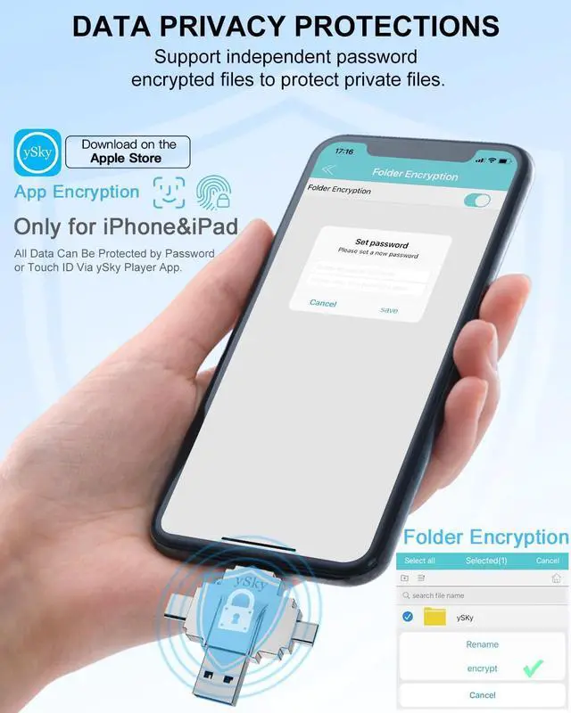 The APP of ySky USB storage is easy to install and easy to use. This photostick for iPhone photos is easy to backup all photos, videos, contacts, files of your iPhone/iPad by One-Click on the APP; you can also store your own backup on your computer with the USB side for Double Insurance. ^^ Plug & Play, Watch&Share Movies/ Photos+ Play music Directly from ySky 4 in1 Flash drive for iPhoneStore your favorite videos, pictures, music to the photo stick for iPhone, then plug and play seamlessly on your iPhone or iPad from ySky app anytime anywhere.
