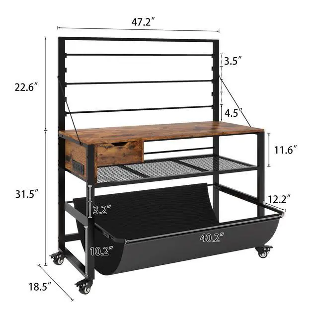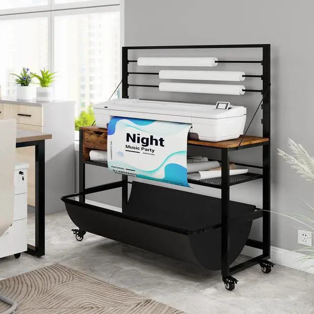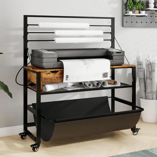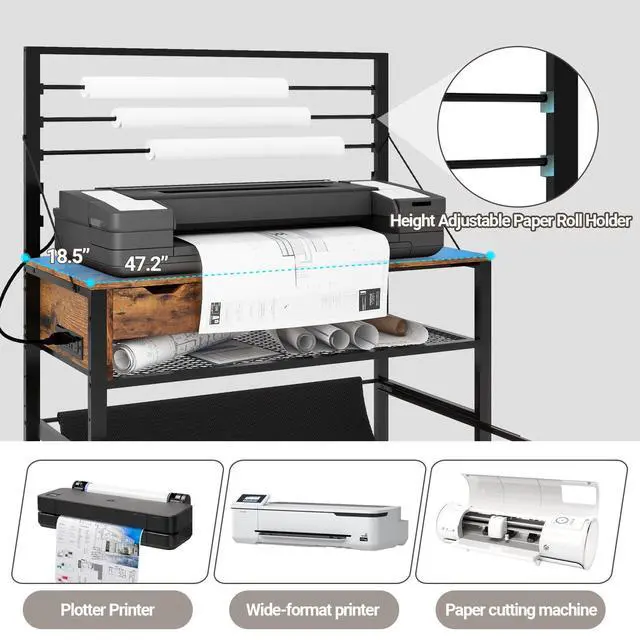 Heavy-Duty & Sturdy ConstructionThis large printer workbench is built with a high-quality wooden top and reinforced steel tubes for exceptional durability. while diagonal stabilizing bars on both sides ensure rock-solid stability to securely hold wide-format printers, plotters, and large printing equipment. ^^ All-in-one Storage SolutionBased on real usage environment, this wide format printer workstation provides versatile organization: an adjustable paper roll holder on top, an accessory storage drawer underneath, height-adjustable shelves for printed drawings, and a pull-out fabric pouch for immediate print collection. ^^ Multi-Functional Work PlatformWith a spacious 47.2" x 18.5" desktop, this heavy-duty tech table accommodates wide-format printers, CAD plotters, and cutting machines simultaneously, creating an efficient production station for professional workflows. ^^ Built-in Power OutletThis professional drafting plotter workstation, designed with 3 AC outlets + USB charging port+ Type C port and extended 5ft power cord for flexible positioning of plotters, large format printers and auxiliary devices from any workspace location. ^^ Industrial-Grade Lockable WheelsEquipped with 4 industrial 360 smooth-rolling lockable casters, This commercial wide format printer stand allows effortless repositioning of fully-loaded equipment, while maintaining stability during printing jobs.