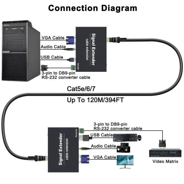 RS232 Serial Control: Bi-directional RS232 connectivity over Cat5e/6/7 allows remote command and control of industrial devices or touchscreen interfaces, all via the network link ^^