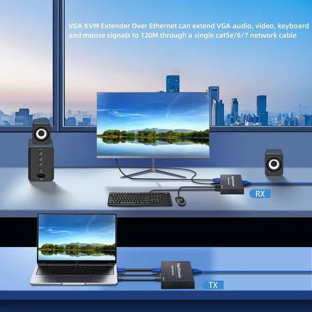 Ethernet-Only VGA Video Transmission: VGA KVM Extender sends uncompressed 19201080@60 Hz video exclusively over a single Cat5e/6/7 cable394 ft/120 m zero-latency link, ensuring point-to-point delivery without alternate media ^^ Dedicated 3.5 mm