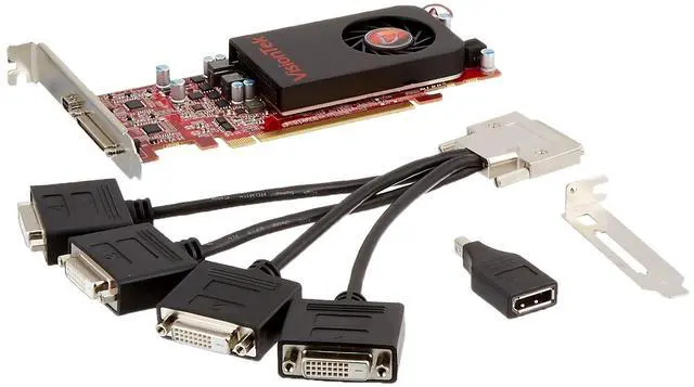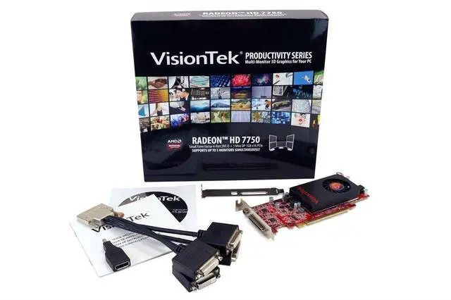The VisionTek Radeon HD 7750 1GB SFF 4-Port DVI-D + 1 Mini DisplayPort x16 PCIe graphics card offers the most features and functionality in its class with complete DirectX 11 support and the world's most advanced graphics, display features and technologies. At the "heart" of the entertainment experience on the PC, things like video playback, editing and transferring content to portable media players are now fast and easy. A great option for business users who engage in multi-view 2D/3D workstation acceleration, the VisionTek Radeon HD 7750 1GB SFF 4-Port DVI-D + 1 Mini DisplayPort x16 PCIe is ideal for multi-monitor productivity in financial and corporate marketplaces.