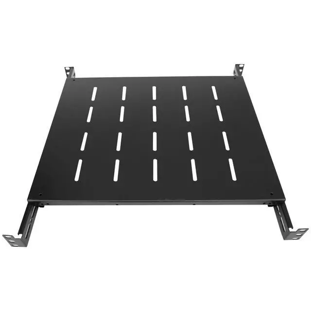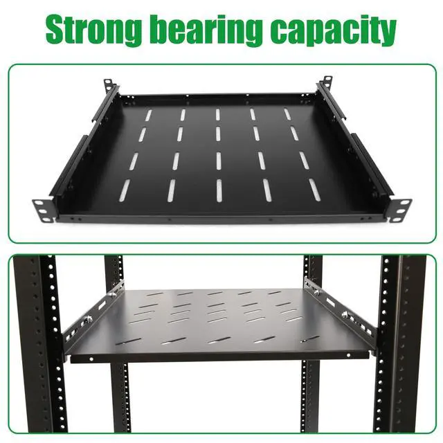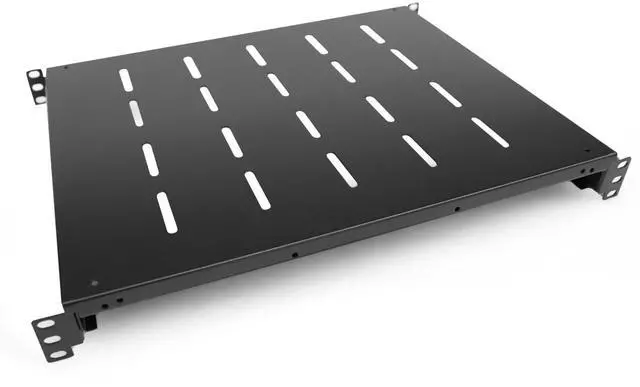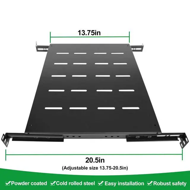 GLOBALRACK Server Rack Shelf/rack mount shelf, Solid, Versatile, This premium quality 1U Server shelf is designed to fit different installation depth of racks and cabinets. The depth can be adjusted from 13.75 to 20.5 in. Surface venting holes help promote passive airflow for optimal heat dissipation. Made of quality cold rolled thickness of the steel plate reaches 2MM ( 0.08 inch). with a powder coated finish that protects them from rust and corrosion. premium quality craftsmanship, heavy duty up to 250lbs weight capacity. easy to mount on a 19" standard rack or cabinet.