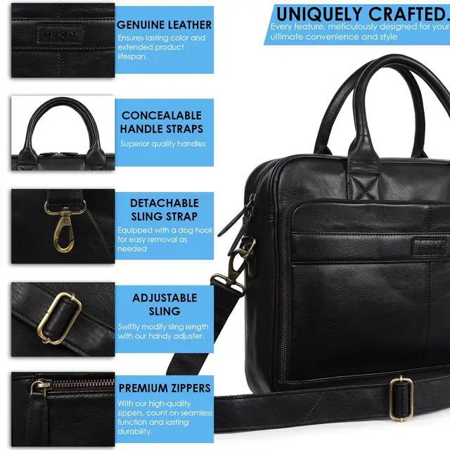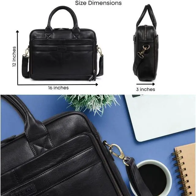 Premium Leather Bag - Our messenger bag for men is made with genuine leather and best quality zippers and closures. this elegant laptop bag 16 inch serves as both a briefcase for women and a stylish leather laptop bag is great for everyday use. ^^ Trolley Compatible - This leather work bag for men and womens briefcase comes with a trolley compatible slot, just strap it on and you are good to go. It also works as Crossbody bag for men. ^^