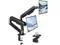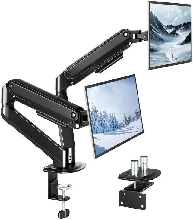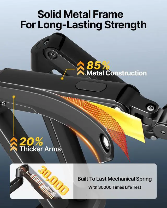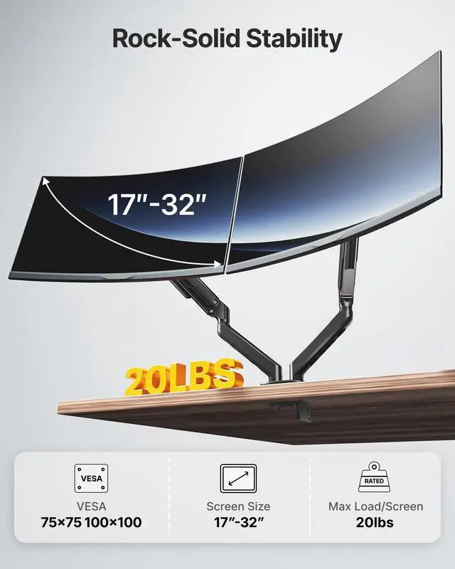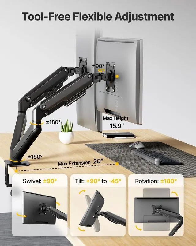 Rock-Solid Steel Dual Monitor MountDual monitor mount fits two screens 1732", supporting up to 20 lbs per arm. Heavy-duty steel frame with reinforced mechanical spring arms provides stable, sag-free support. Each arm lifts monitors up to 15.9" high and extends up to 19.9" for maximum flexibility ^^ Effortless Mechanical Spring AdjustmentEquipped with dual mechanical spring arms for precise, smooth height and angle adjustments. Unlike gas springs, the mechanical system offers stable positioning with fewer failure points, keeping both monitors securely in place throughout daily use ^^ 360 Full Motion for Maximum ComfortEnjoy maximum flexibility with tilt (+90 / -45), swivel (90), and 360 rotation on each arm.