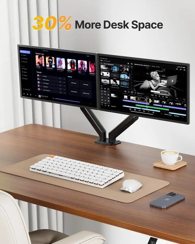 Extend, retract, and adjust each monitor independently to create the perfect ergonomic setupreducing neck, shoulder, and eye strain during long work or gaming sessions ^^ Instantly Free Up 30% More Desk SpaceLift both monitors off your desk to free up valuable workspace. Our dual monitor stand increases desk area by up to 30%, creating a cleaner and more organized environment with integrated cable management to keep cords tidy and out of sight ^^ Quick Setup with Universal CompatibilityDual mounting options with C-clamp and grommet base for desks 10-80mm thick (clamp) or 10-40mm thick (grommet).