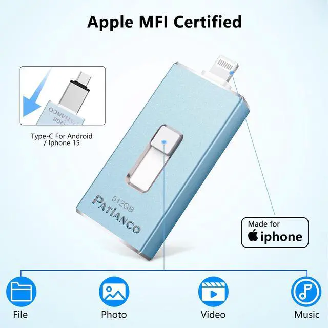512GB Apple Certified iPhone-Photo-Stick- Quickly Expand More SpacePicture keeper for Apple device with USB 3.0 for iPhone memory stick backup usb flash drive expands extra 512GB space, using this usb thumb drive, there are no more concerns about insufficient memory of iPhone/iPad. Mfi Certified flash drive guarantees fast and stable data transfers, one HD movies ( approx. 1GB) only needs about 20s. It's ideal for adding more storage to iPhone/iPad. ^^ iOS MFi Certified Photo Stick for iPhone - Safe and Quality AssuranceThis photo stick for iPhone photo storage backup certified by iOS MFi with latest lightning connector, memory stick for iPhone supports all iOS models with Lighting port ( iOS 9.0 or