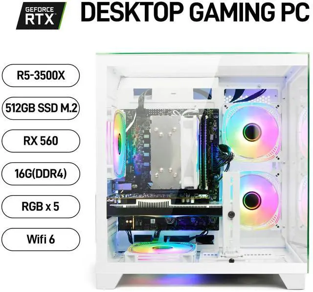 Powerful Multi-Core Performance, Smooth Multitasking Equipped with the Ryzen 5 3500X 6-core, 6-thread processor, featuring a base frequency of 3.6GH z and a maximum boost up to 4.1GH z. Whether for daily office tasks, content creation, or simultaneous multitasking, it delivers smooth and efficient responsiveness, effortlessly handling programming, image processing, and mainstream design software demands. ^^ Entry-Level Gaming Graphics Card for Mainstream Esports and Online Games Equipped with an Radeon RX 560 4GB GDDR5 discrete graphics card supporting DirectX 12 and Vulkan API, it delivers smooth gameplay for popular esports titles like League of Legends, CS: GO, and Overwatch. It also handles light AAA titles at medium-low settings, meeting the entertainment needs of casual gamers and students ^^ Efficient Cooling and Stable Power Delivery for Long-Term Reliability Features a custom air-cooling system with optimized airflow design, ensuring CPU and GPU remain cool and stable under heavy loads. ^^ Flexible Upgrade Path for Future-Proof Expansion The motherboard includes multiple reserved slots, an M. 2 SSD interface, and DDR4 memory slots, supporting future additions like hard drives, memory upgrades, or graphics card replacements. The case features a well-organized internal layout, allowing users to expand components as needed while balancing affordability and long-term value. ^^ Ready to Use Out of the Box with Thoughtful Pre-Installation and Support Plug and play with no complicated setup required. Includes detailed manuals and online technical support. Backed by a 1-year manufacturer warranty with fast response to service issues for worry-free purchasing.
