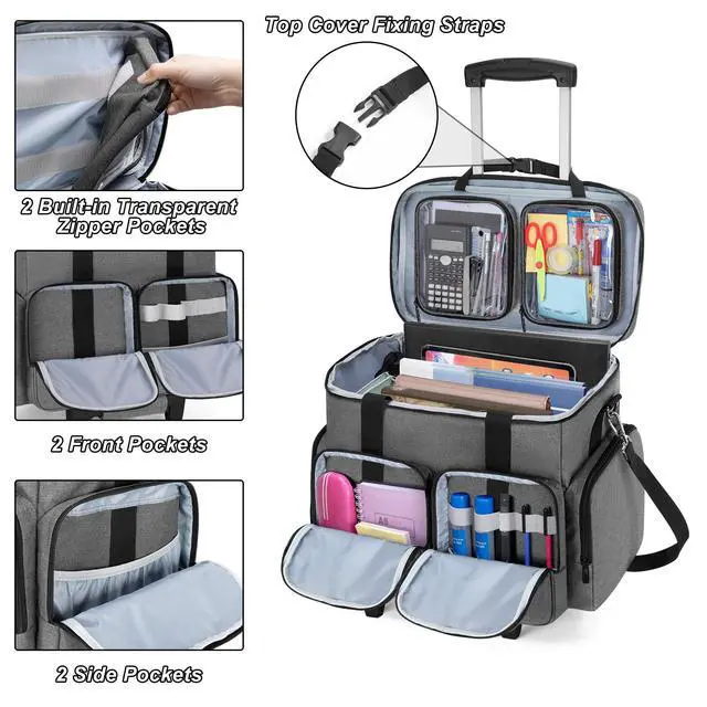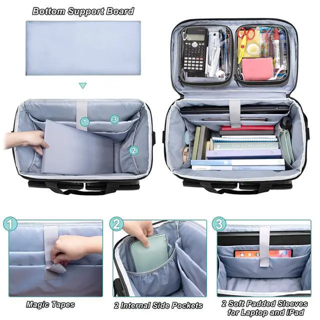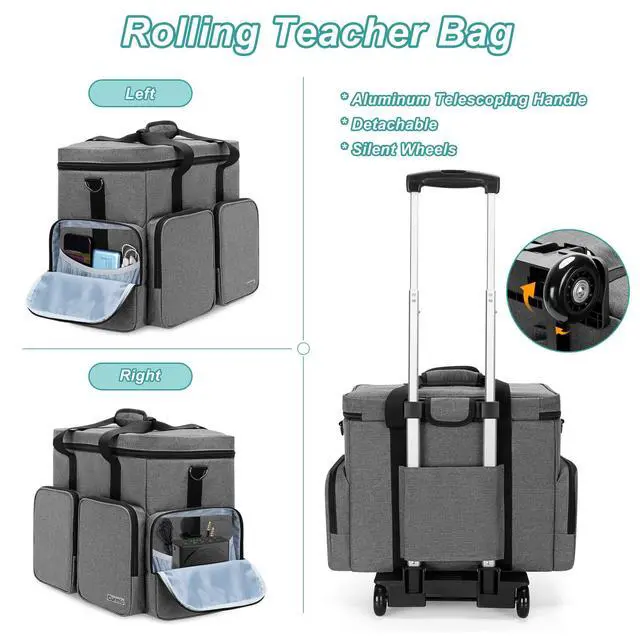 ROOMY MAIN COMPARTMENT - Rolling teacher tote with 2 padded sleeves for file folder, iPad or laptop (up to 15.6" ). Large capacity main compartment for carrying teacher essentials, like binders, research paper. 2 interior side pockets for teacher cosmetics, water bottles, umbrellas, etc. ^^ WELL ORGANIZED - 2 front pockets, one of the front pocket attached with multiple elastic loops for wireless presenter remote, sticky-note, etc. 2 exterior side pockets for holding hard drive, power bank or teacher voice amplifier. 2 built-in visible zipper pockets attached to the cover with magic tapes for some small teaching supplies.