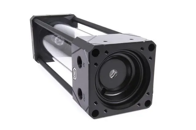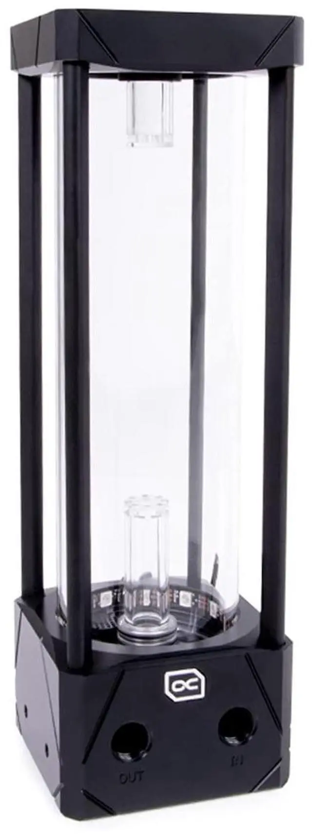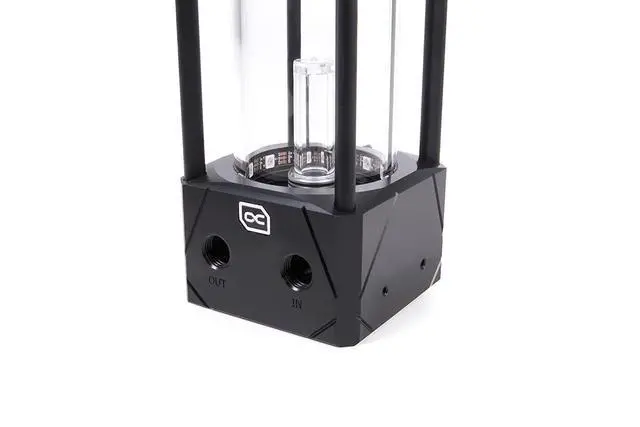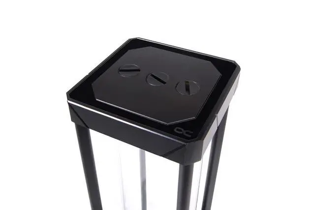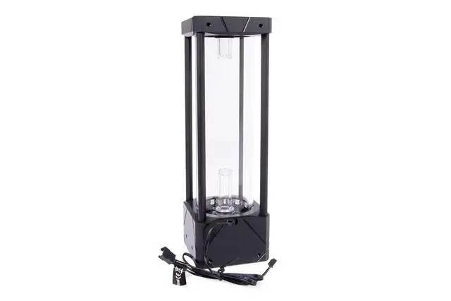 Depending on the strength of the flow of the loop, the effect is stronger or weaker. There is one riser tube with this effect at the bottom inlet and one at the top inlet. This Eisbecher Aurora reservoir is compatible with all original D5 Xylem/Lowara pumps and all Alphacool VPP pumps.