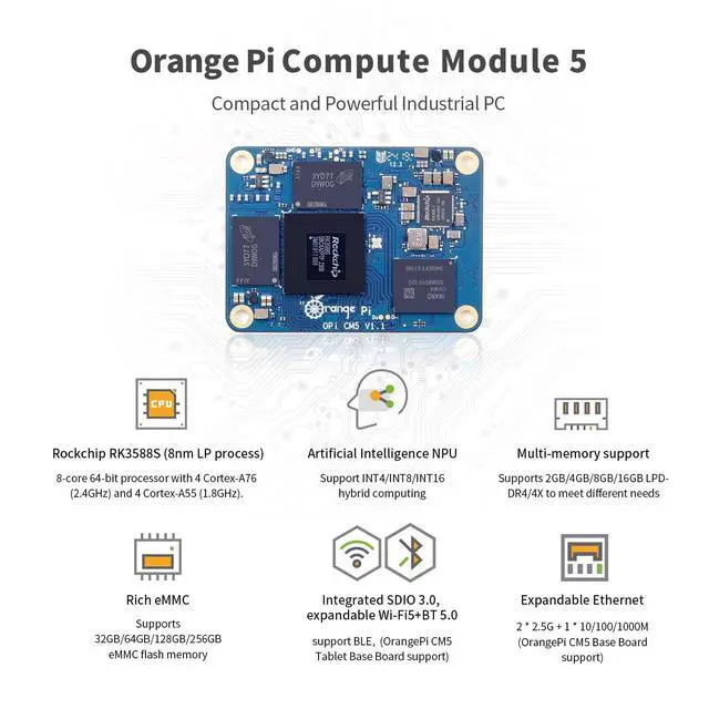 Processor]: Equipped with the Rockchip RK3588S 8-core 64-bit processor, Orange Pi CM5 boasts 4 Cortex-A76 cores running at 2.4GH z and 4 Cortex-A55 cores at 1.8GH z, all built on an advanced 8nm process.