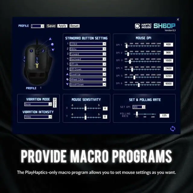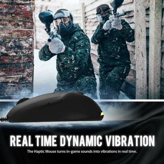 Double Excitement, Double Thrill at the hand As a higher version of the existing product, it is designed with an external haptic module from built-in for a realistic game and unexpectable haptic experience through stereoscopic vibration from the sound of the video or game. ^^ Set for Haptic Mode and Vibration Intensity It can be customized with three vibration intensities to your preference and the haptic mode on the bottom of the mouse can be set by four different modes for the following order. (Left click, Both click, Vibration + Sound, Vibration only) ** Haptic mode is expressed by color change and vibration intensity is expressed by color brightness change.