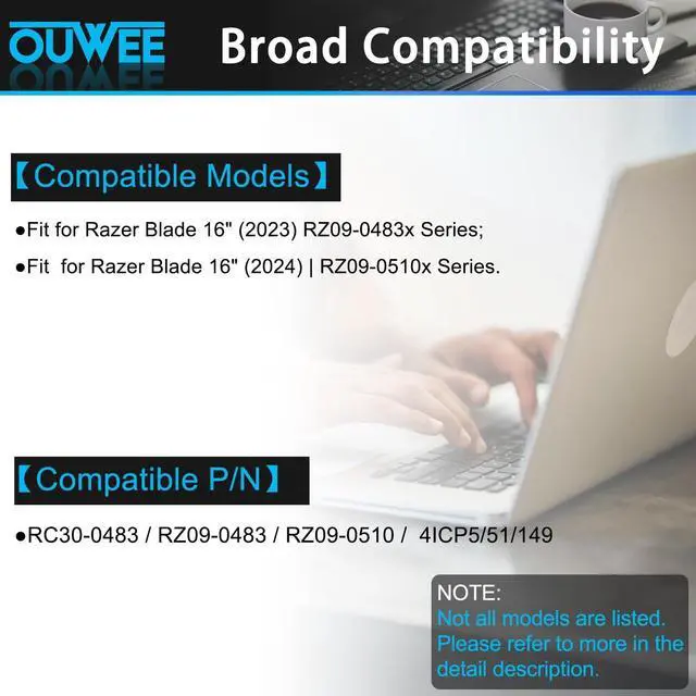 Replacement for Part Number: RC30-0483 / RZ09-0483 / RZ09-0510 / 4ICP5/51/1499. Compatible Models (use "Ctrl+F to find your model quickly")Fit for Razer Blade 16" (2023) RZ09-0483x Series; Fit for Razer Blade 16" (2024) ^^ RZ09-0510x Series. Not all models are listed, please check the part number of your original battery. 10.