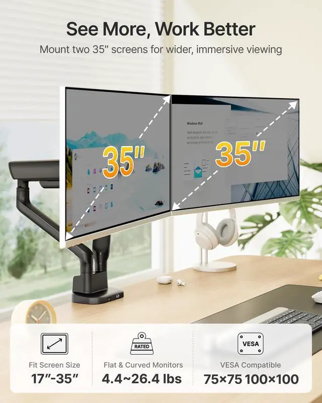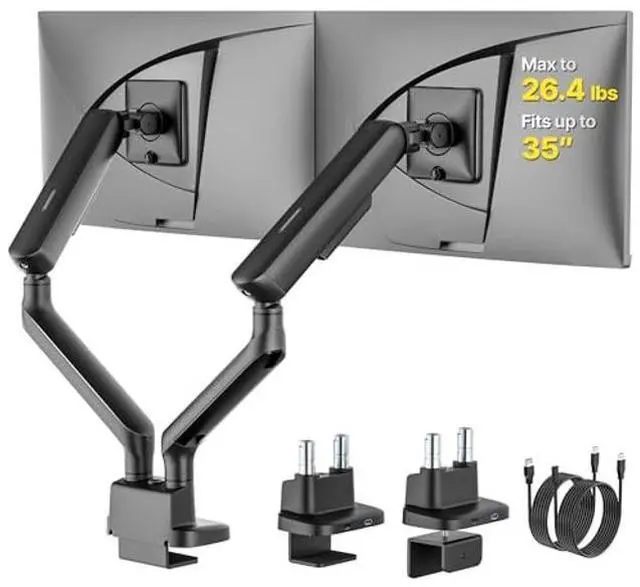 BROAD COMPATIBILITY FOR DUAL SCREENS: monTEK dual monitor arm fits most 17"35" flat or curved screens, supporting up to 26.4 lbs per arm for stable and reliable performance. Fully compliant with VESA 7575mm and 100100mm standards. Ideal for office workstations, home setups, and gaming rigs, this dual monitor mount adapts easily to a wide range of setups and screen types. ^^
