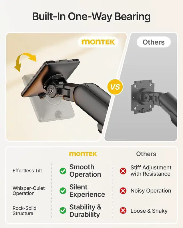 & LONG-LASTING PERFORMANCE: This monitor arm features integrated precision bearings for exceptionally smooth, effortless movement. Tilt, swivel, and adjust your screen with a gentle pushno stiffness, no noise. The low-friction bearing system helping prevent sagging or loosening over time. Compared to other monitor arms without bearings, this upgraded design maintains consistent tension and reliable support even after years of daily adjustments. ^^