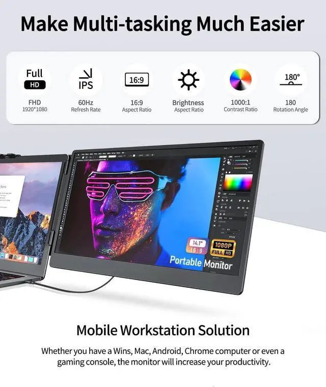 [More Eeffective for Work] The ultra-portable dual monitors screen provides multiple display modes [copy mode/extension mode/second screen mode. In extended mode, you can easily manage multiple applications and various documents in a neat workbench, which definitely boost vour workefficiency by up to 200%.