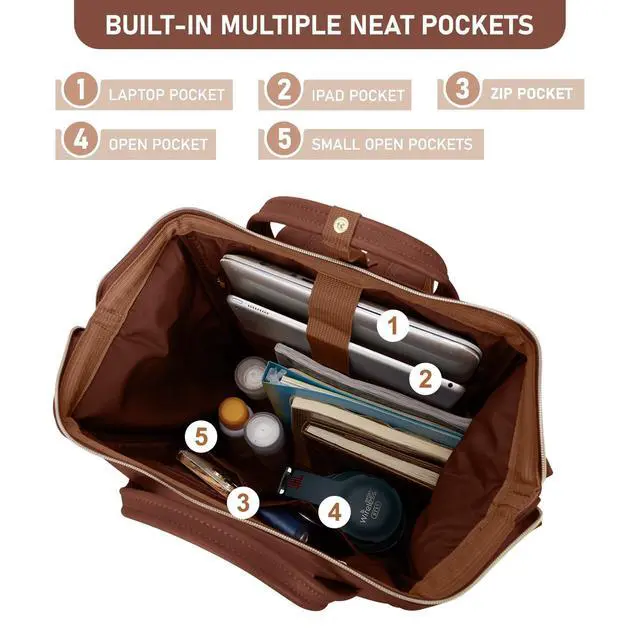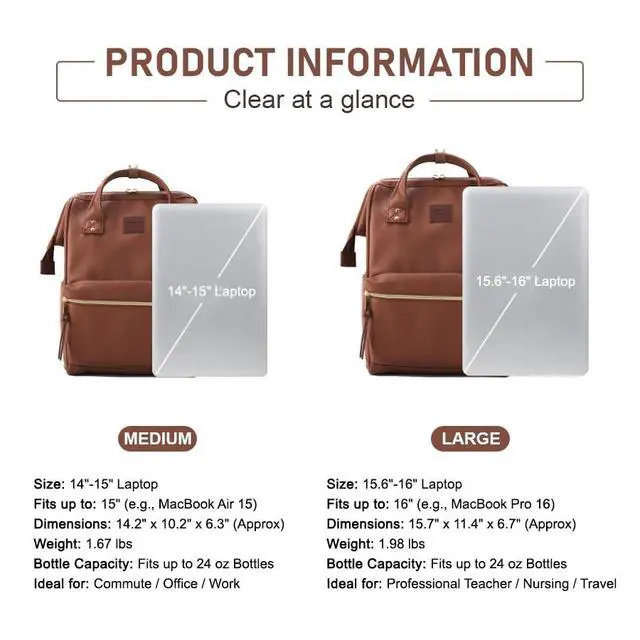 [CHOOSE YOUR PERFECT FIT: MEDIUM vs LARGE] Tailored for your tech. Medium Size fits up to 14"-15" laptops (compatible with MacBook Air 15); Large Size is engineered for 15.6" -16" laptops (compatible with MacBook Pro 16). Both sizes include a separate slot for a 12.9" iPad, keeping your professional gadgets organized and scratch-free. ^^ 4. [ALL-DAY ERGONOMIC COMFORT & SECURITY] Specifically designed for teachers and nurses who are on their feet. Features breathable honeycomb mesh shoulder straps and a ventilated back panel to prevent sweat. Includes a hidden anti-theft back pocket for your passport and phone, plus a sturdy luggage strap for hands-free airport travel. ^^ 5. [WATER-RESISTANT DURABILITY & SUPPORT] Built with high-density, water-resistant PU leather and reinforced metal zippers, this bag protects your electronics from unexpected rain and daily wear. The reinforced base ensures the backpack stands upright even when empty. We back every purchase with dedicated 24/7 customer support for a worry-free professional investment.