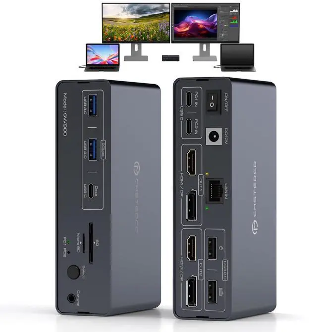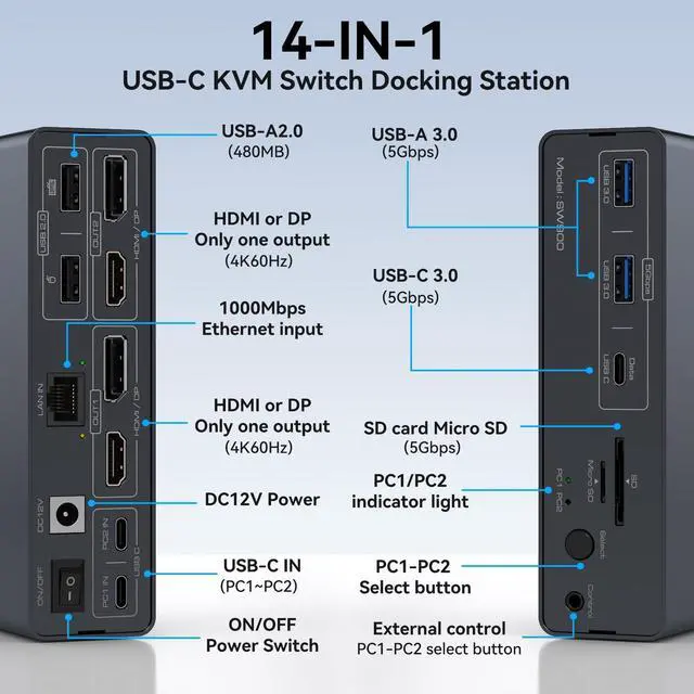 KVM Switch 2 Montors 2 ComputersThe laptop kvm switch 2 monitors not only allows you to easily manage and switch between two computers with just one set of keyboard and mouse while simultaneously controlling two monitors, but also share a 14 in 1 Docking Station, including 2 USBA 3.0 DatePort; 1 USBC DatePort; Displayports; HDMI port; gigabit ethernet port; Micro SD/SD card slot, etc.; The dual monitor KVM switch is ideal for both professional and home office setups.