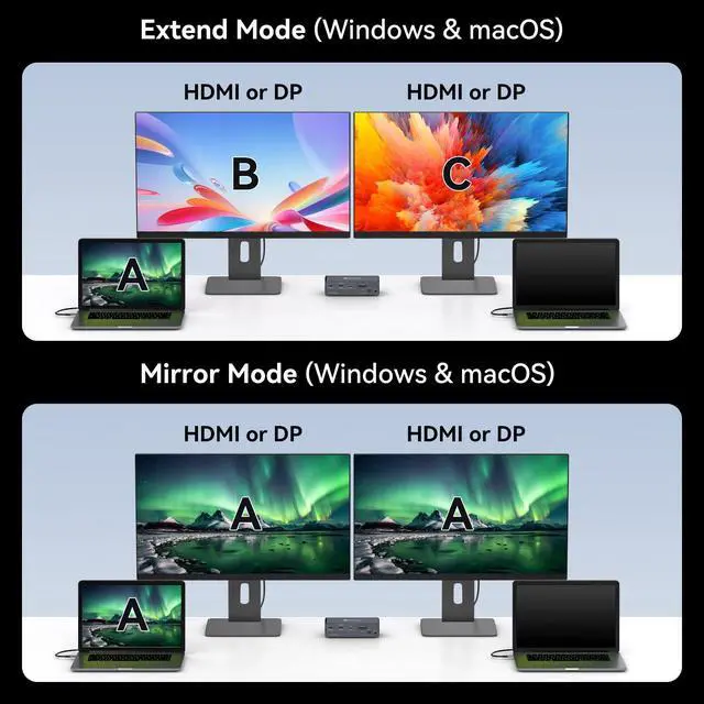 Note: The Displaylink driver must be installed when using the USB C KVM switch docking station, otherwise monitors will not output images properly ^^ Important Notice1. Please ensure that your laptop must be equipped with a USB-C 3.2 (or higher) interface, Other USB-C interfaces cannot be used. 2. This KVM Switch Docking Station don't support PD charging. 3. OUT1/OUT 2 only supports one output and can output to a maximum of two displays. 4. The USB-C port on the front panel only transmits data and does not support PD charging or video transmission. 5. For optimal 4K@60Hz performance, please using high-quality cables (under 3 feet/1 meter is ideal) that support DP 1.4 and HDMI 2.1 standards ^^ Support Ultra HD 4K@60hz VisualsThe KVM switch two computer supports resolutions up to 3840*2160@60Hz (4K@60hz), suitable for Mac and PC. It breaks through Mac OS limitations, enabling displays to operate in extended mode on both Windows and Mac OS systems, with each screen supporting up to 4K@60Hz resolution. The KVM switches OUT1 and OUT2 with one HDMI port and one DP port. Users can select the appropriate port for connection based on their needs (OUT1/OUT2 only supports one output, OUT1 selects HDMI or DP output, OUT2 selects HDMI or DP output) ^^ Mirroring and Extended DisplayThe KVM switch 2 monitors 2 computers supports extended mode and mirroring mode, suitable for desktop/laptop computers (Windows systems support MST technology).