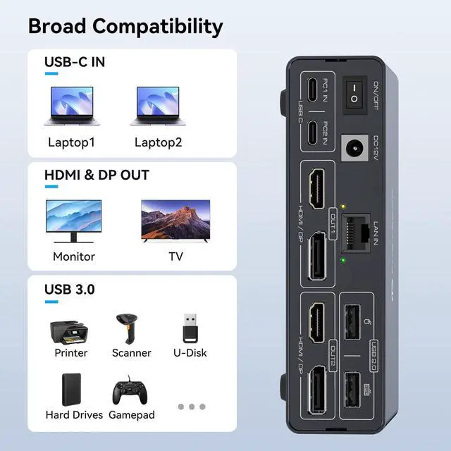 Note: A HDMI-to-DVI cable is required to connect to a DVI display (not included). Compatible with multiple systems, seamlessly compatible with macOS, Windows, Chrome OS, Linux, and Android devices. Note that your device must be equipped with a USB-C 3.2 (or higher) interface ^^ Package Contents & After-sales serviceThe package includes one USBC KVM switch docking stations, one high quality USBA-C to USB C cable, one 12V charger, one external controller kits. If the device is abnormal within the 12-month usage period, we also provide return and exchange services. If you have any questions, please feel free to contact us at any time. We will give the most professional answers and give you a satisfactory shopping experience