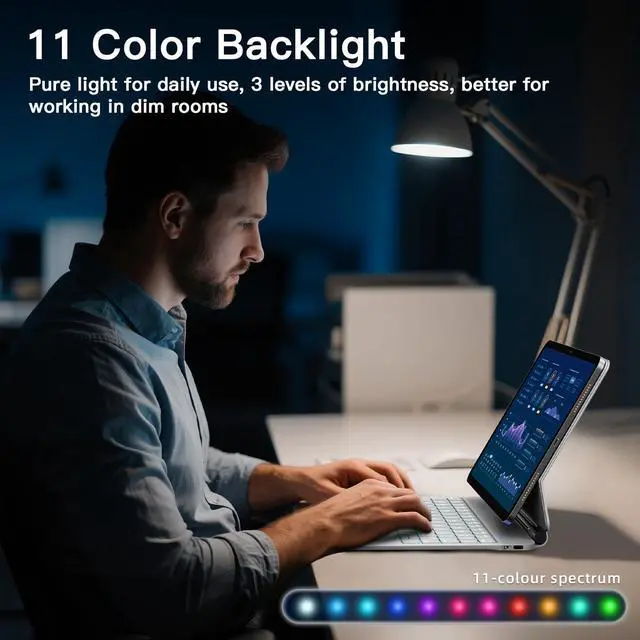 ^^ Backlight andshortcut key: 11-color backlight keyboard with shortcuts - fluidly and accurately typing on the lighted keyboard for iPad Pro 11 even in a dark room, ergonomic keys, 11 colors of backlight, and three adjustable backlight brightness levels give you a comfortable typing experience. No more searching around for basic functions, be more efficient with a full row of PadOS shortcuts to adjust brightness levels, change backlit colors, media, volume control, and more.